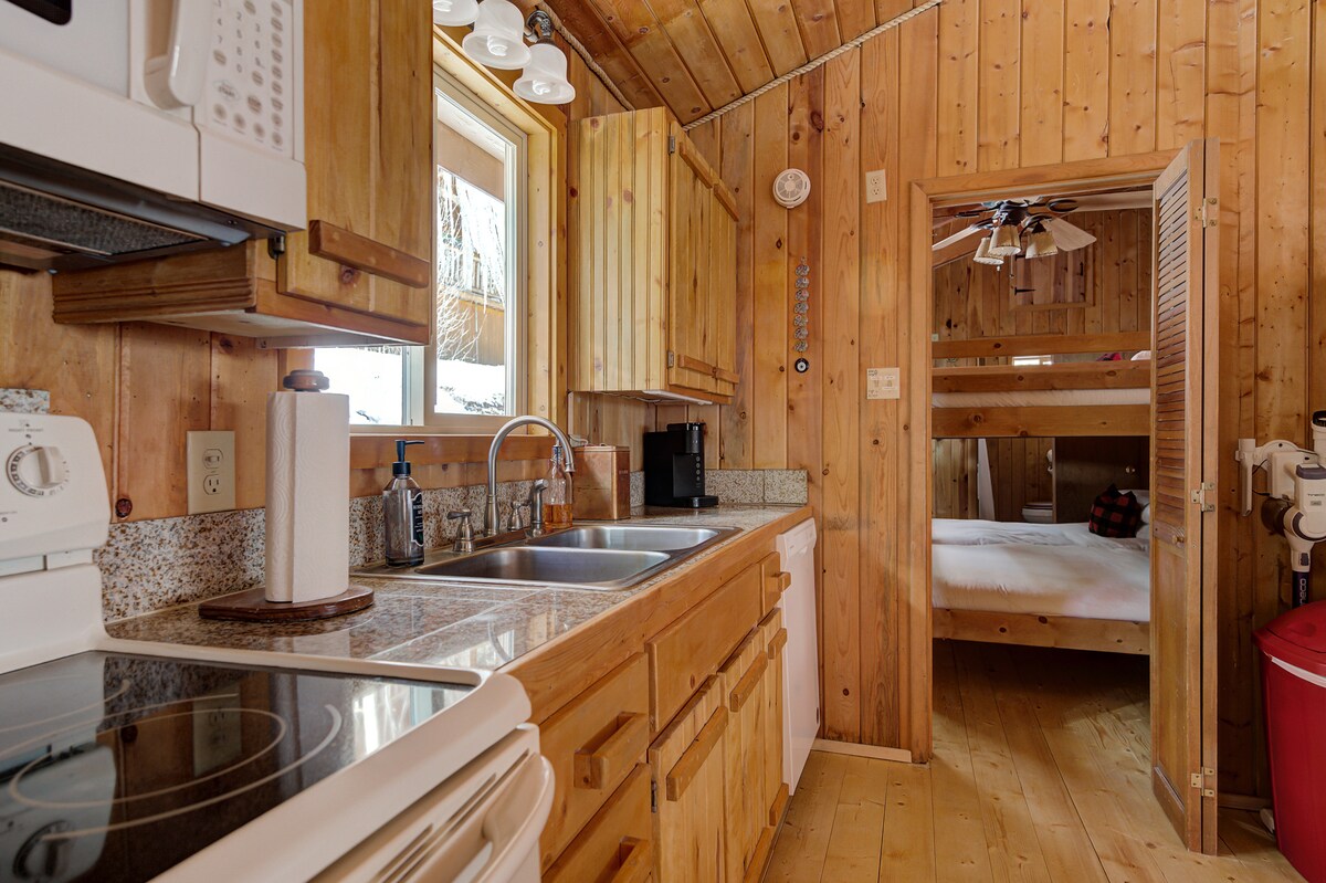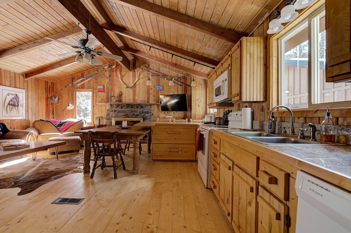 Relax with your whole family in this iconic property that backs up to the National Forest, with the river just down below. Cozy up to the fire, with plenty of wood stocked for your stay! Five comfortable beds allow you to have ample sleeping capacity, and two bathrooms with an electric hot water heater so everyone gets a hot shower! A washer/dryer combo make it easy to keep up with the outdoor clothes and fiber optic internet keep you streaming and working, if needed. A true home away from home.